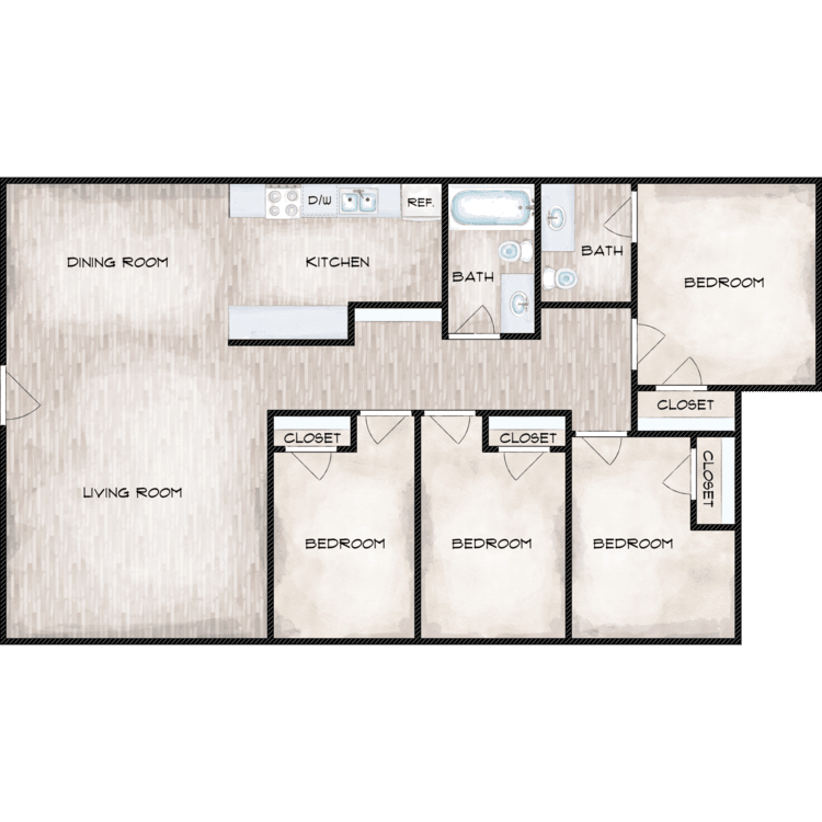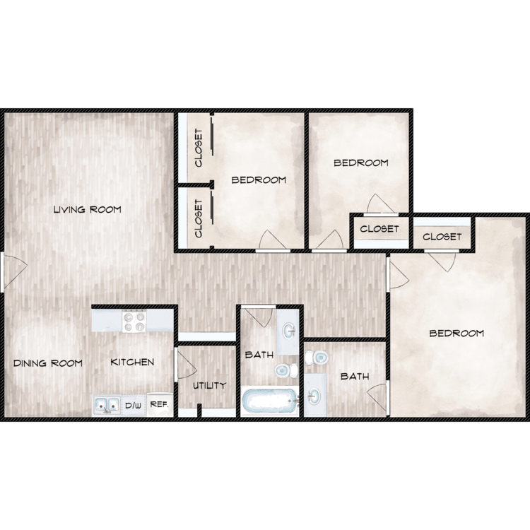 Gateway East Apartments is proud to offer a variety of floor plans to include 1, 2, 3 and 4 bedroom options. Finding the apartment home to fit your needs has never been easier. Our wonderful floor plan amenities include ceiling fans, dishwashers. refrigerators, carpet and vinyl floors. Gateway East Apartments offers an exciting standard of apartment living you won't find anywhere else.